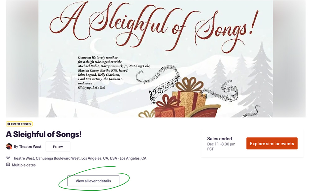 Confused by Eventbrite’s “Event ended” label? You’re in the right place. We still have performances coming up. Click “View all event details” to see all dates and grab tickets.